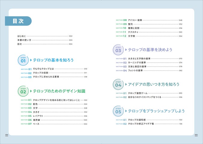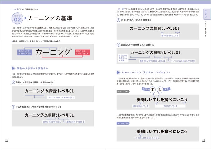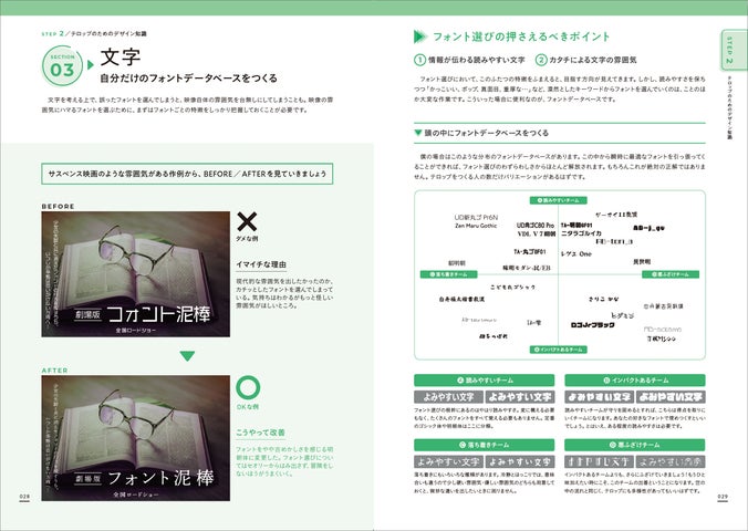 - 基礎的な考え方や文字の大きさ、レイアウト、フォントなどについて解説されており、アレンジやモーションの付け方、作例集も掲載されている