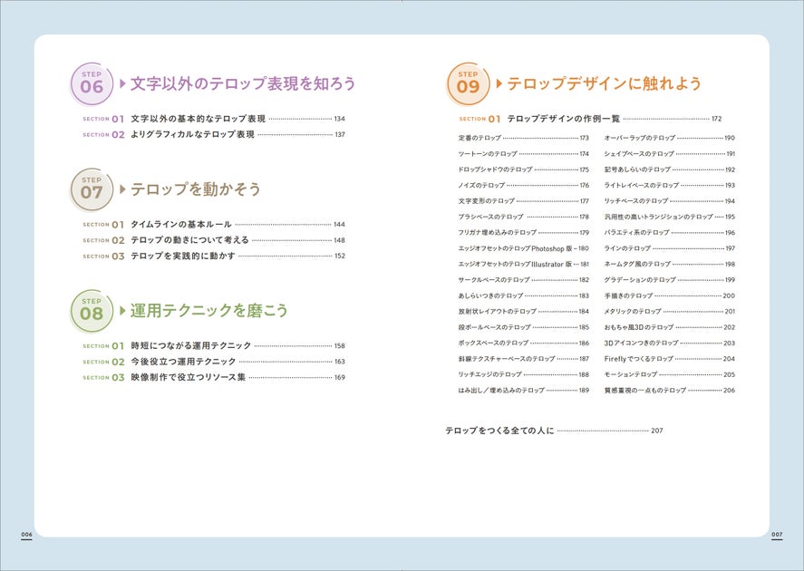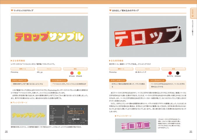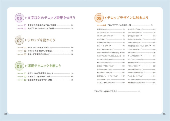 さらに、アレンジやモーションの付け方、作例集も掲載されており、テロップに困った時に役立つ一冊となっています。