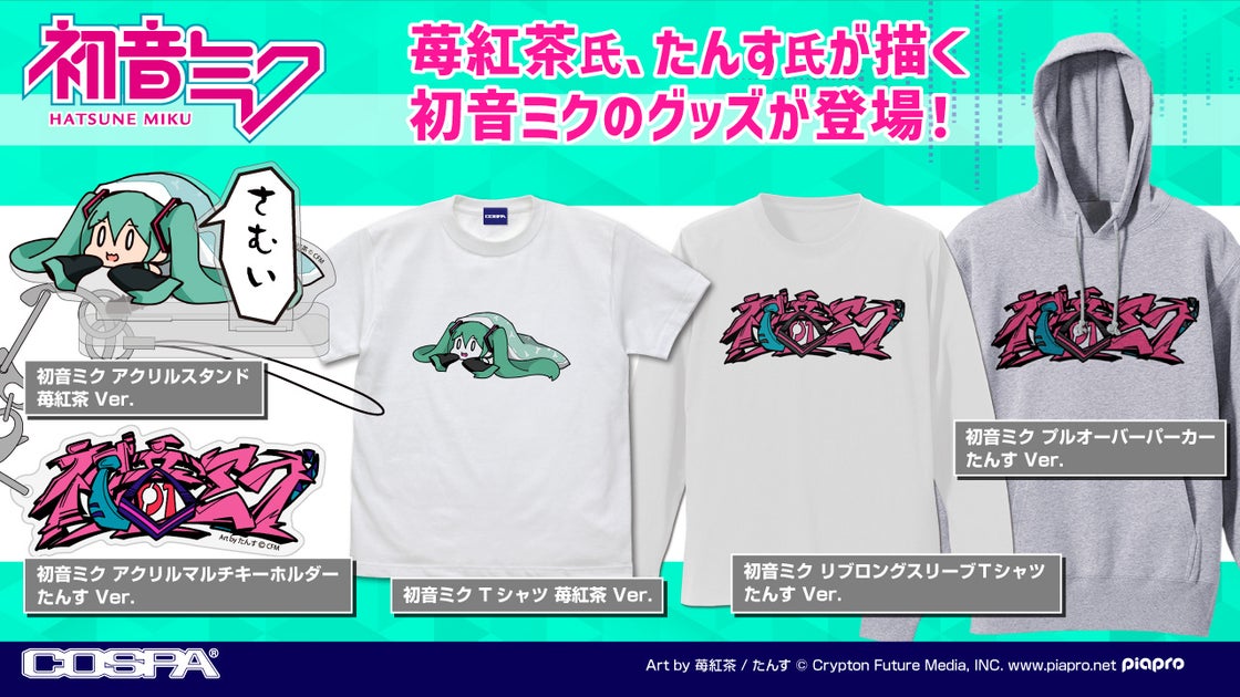 COSPAから、初音ミク、鏡音リン・鏡音レン、巡音ルカ、MEIKO、KAITOの新作グッズが登場しました!イラストレーターの「苺紅茶」さん、「えー助」さん、「6⚪︎2 ロクマルニ」さん、「たんす」さん、「あと」さんの素敵なイラストを使用し、クールなロゴデザインや可愛らしいイラストが目を引くデザインに仕上げられています。