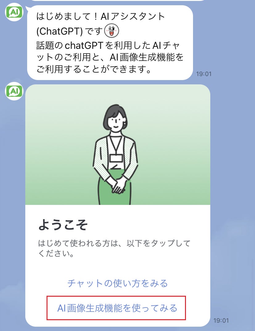 LINEで手軽にChatGPTのAIとチャットやStable Diffusionを利用した画像作成ができるサービスです。