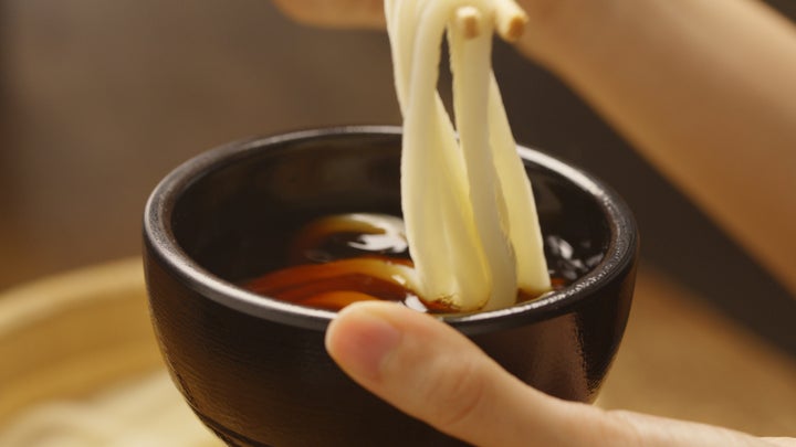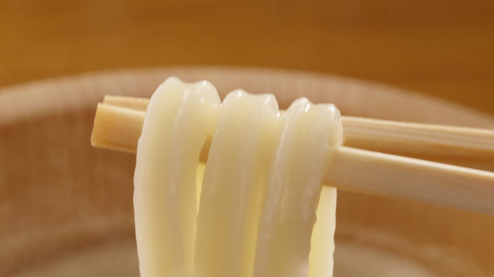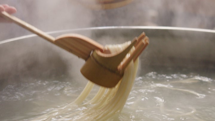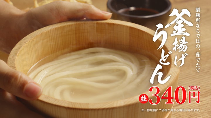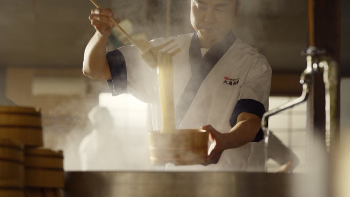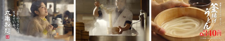新しいテレビCMでは、湯気の立ち上る釜から熱々の麺をすくい上げる麺職人の姿や、丁寧に桶に盛り付ける様子が描かれています。