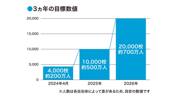 現在、約2,000校に導入・登録されており、2024年には4,000校、2025年には10,000校、2026年には20,000校の導入を目指しています。