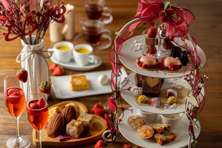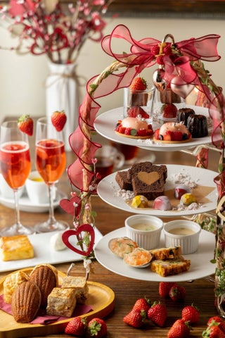 バレンタインやホワイトデーをイメージしたスイーツが3段のスタンドに並びます。