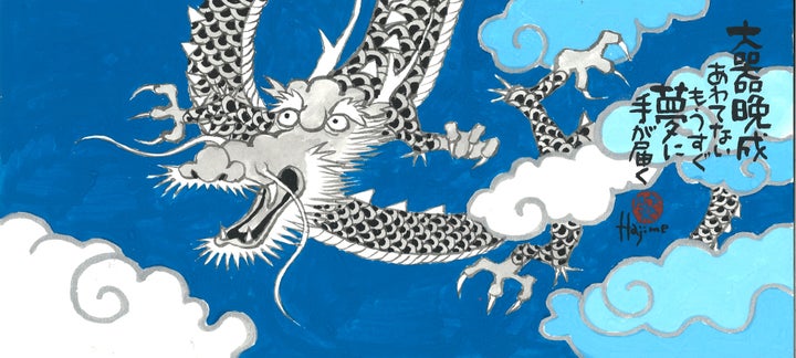 「大器晩成 あわてない もうすぐ夢に手が届く」というタイトルの墨彩画が展示されます。
