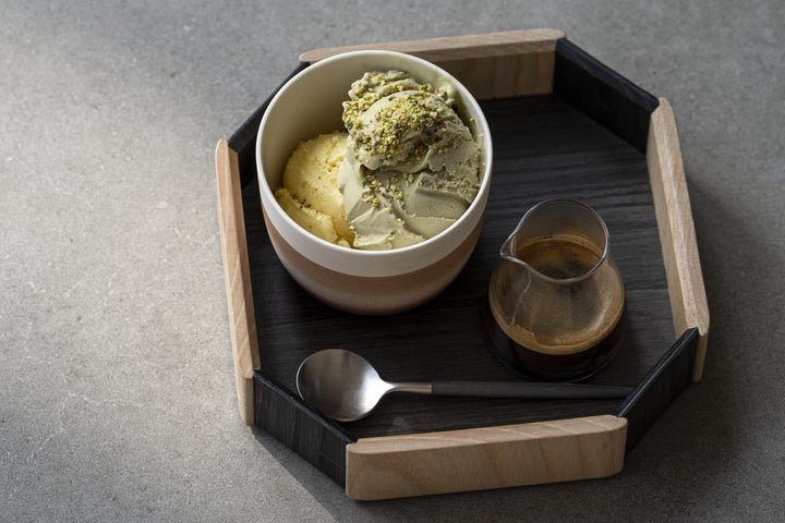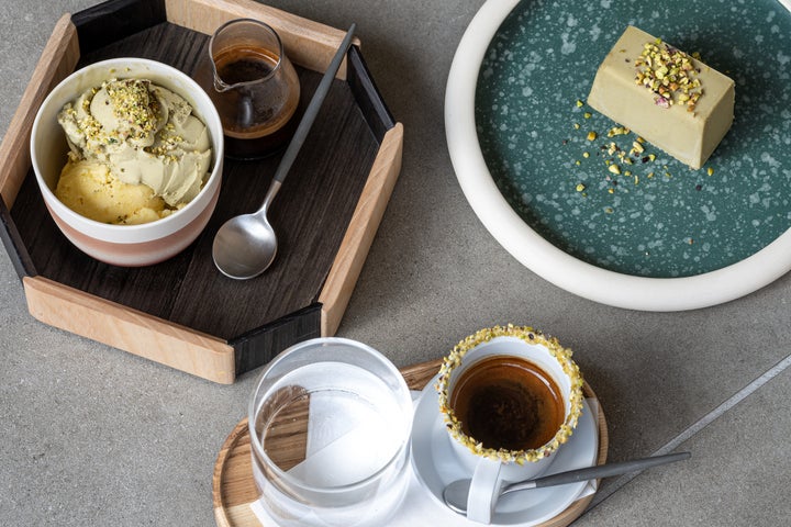 - ピスタチオスイーツテリーヌ ペアリングセット、ピスタチオアイスクリームアフォガード、ピスタチオコーヒー、abno×MAX PISTACHIO スペシャルコース