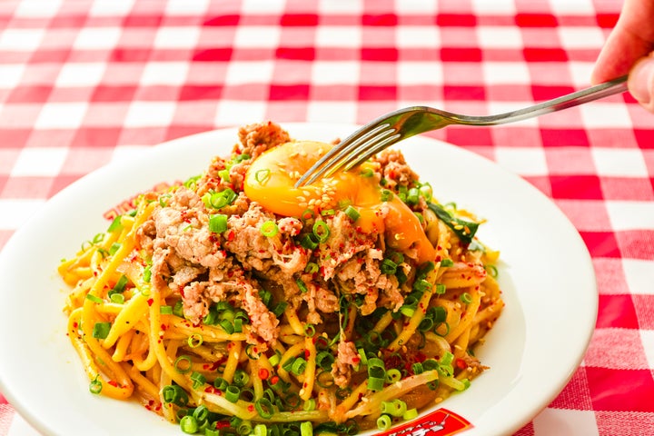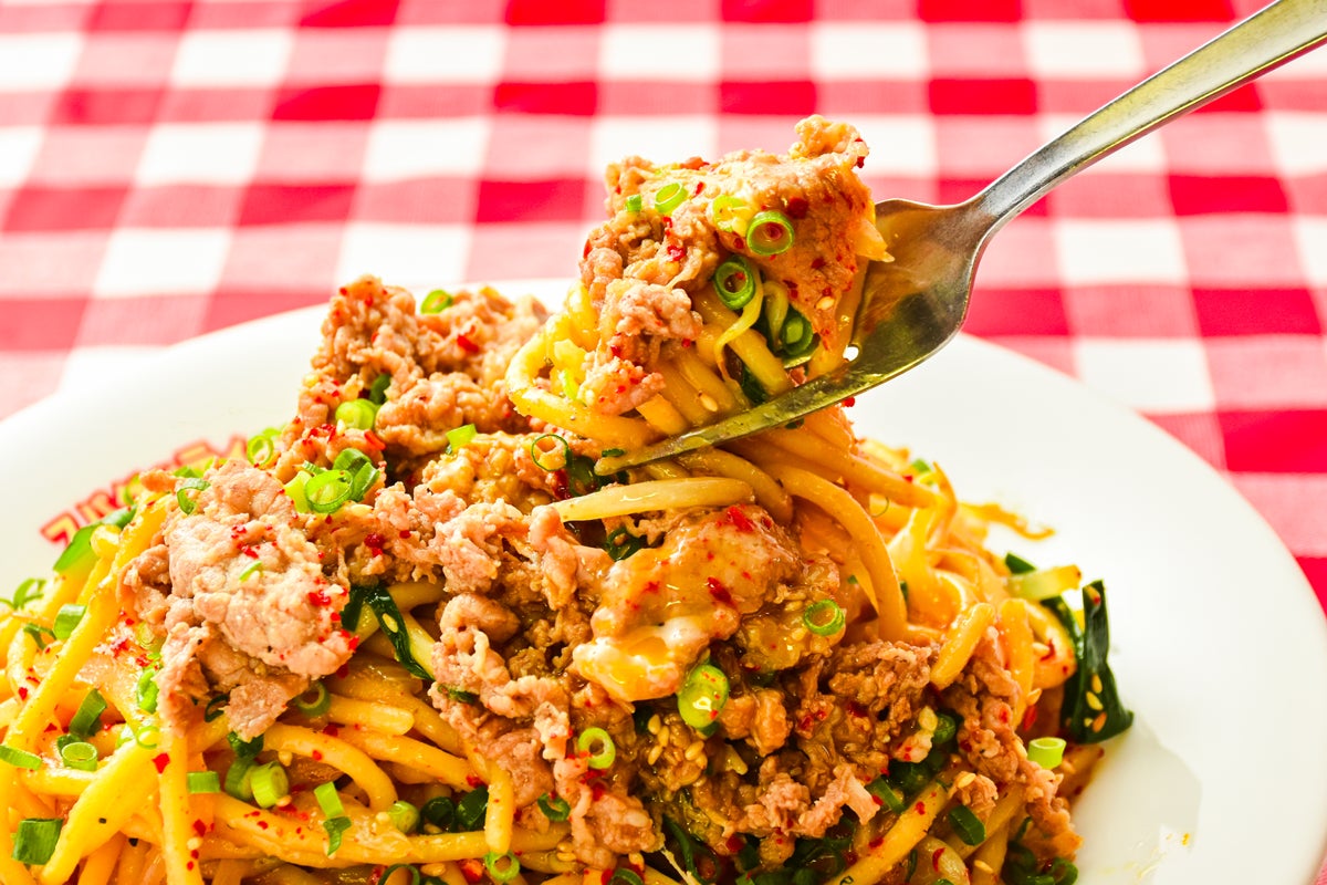 - 韓国風プルコギが太麺スパゲッティーに染みわたる