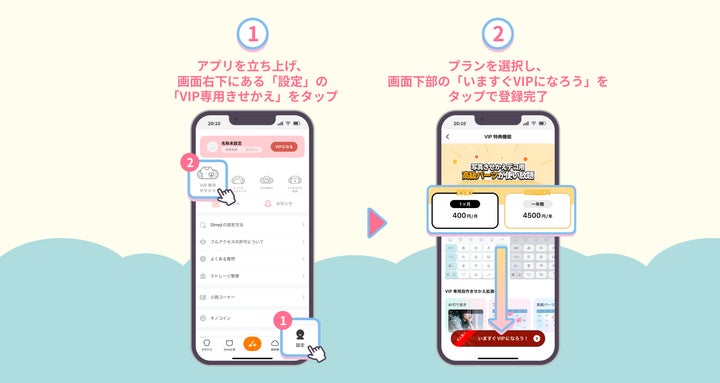 Simeji VIPは月額400円(年額4,500円)で、VIP会員専用の豪華なきせかえやデコレーションパーツが無制限に使えます。