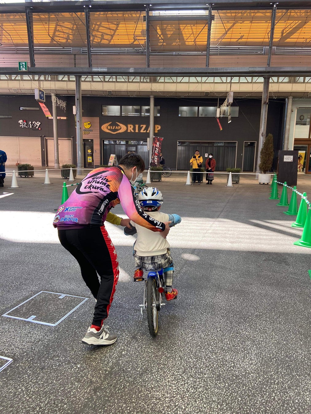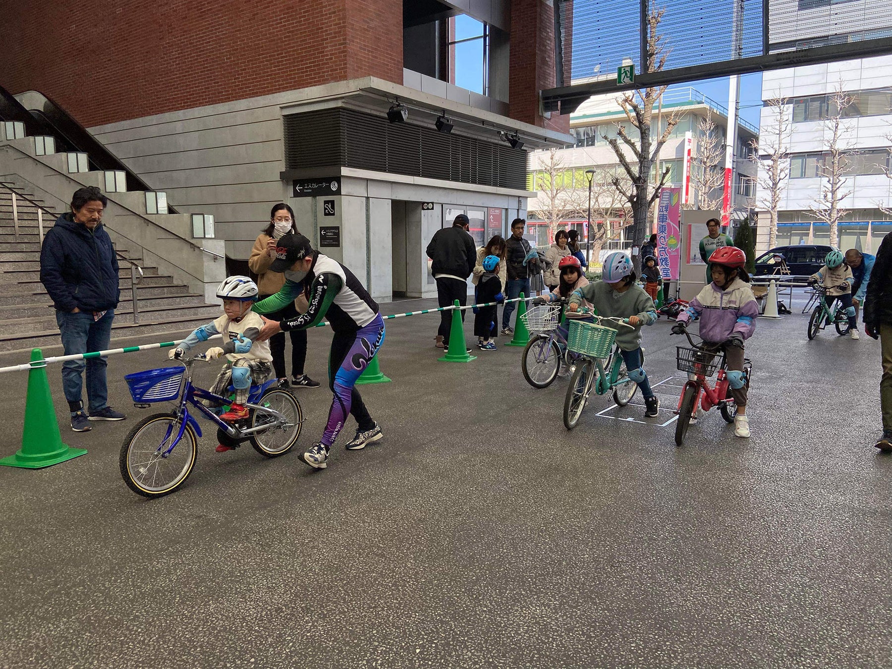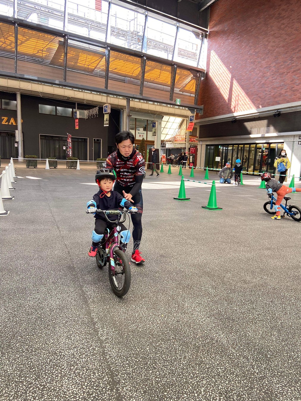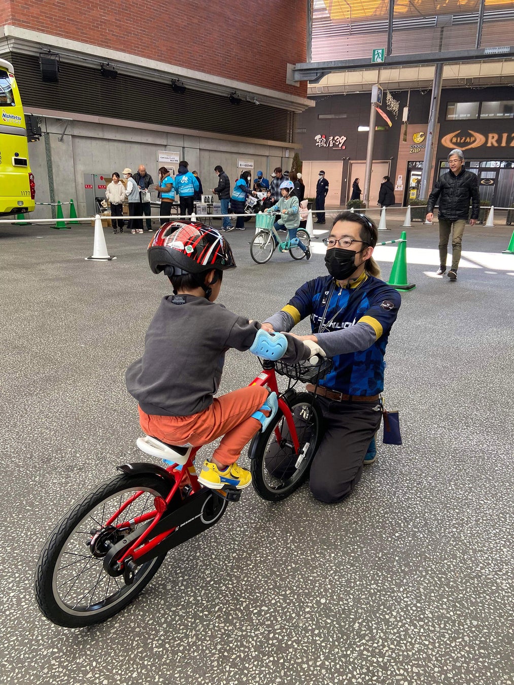 自転車乗り方教室では、VC FUKUOKAのスタッフや久留米競輪の選手が個別に指導し、安全教育も行われました。