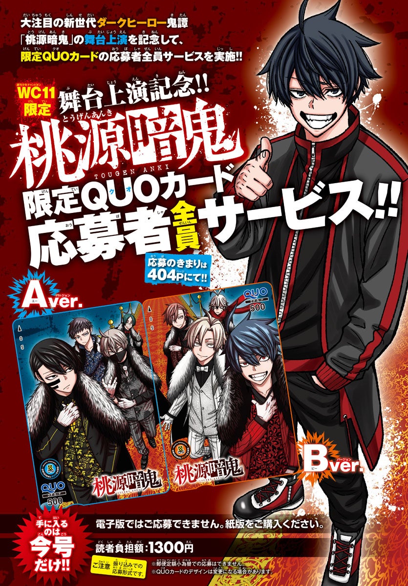 株式会社秋田書店は、週刊少年漫画誌『週刊少年チャンピオン』11号で舞台「桃源暗鬼」の上演記念として、表紙&巻頭カラーで特集します。