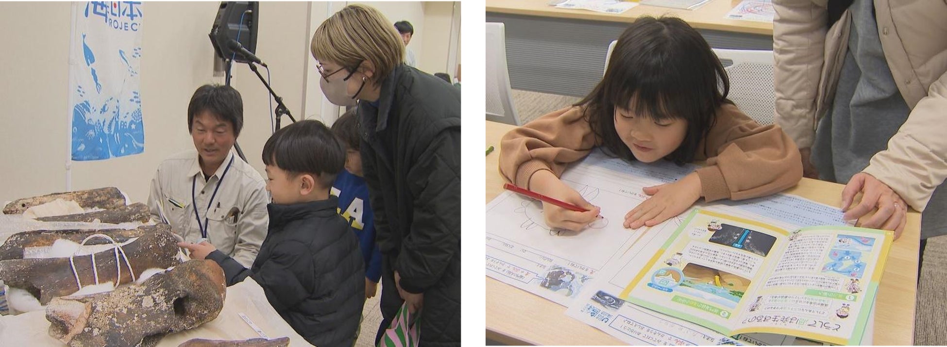 ワークショップでは、渦潮の仕組みやお風呂での渦潮の作り方を学び、鳴門海峡から引き揚げられたナウマンゾウやホタテの化石に触れることもできました。