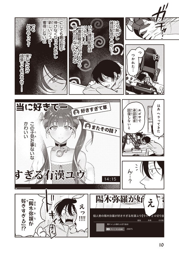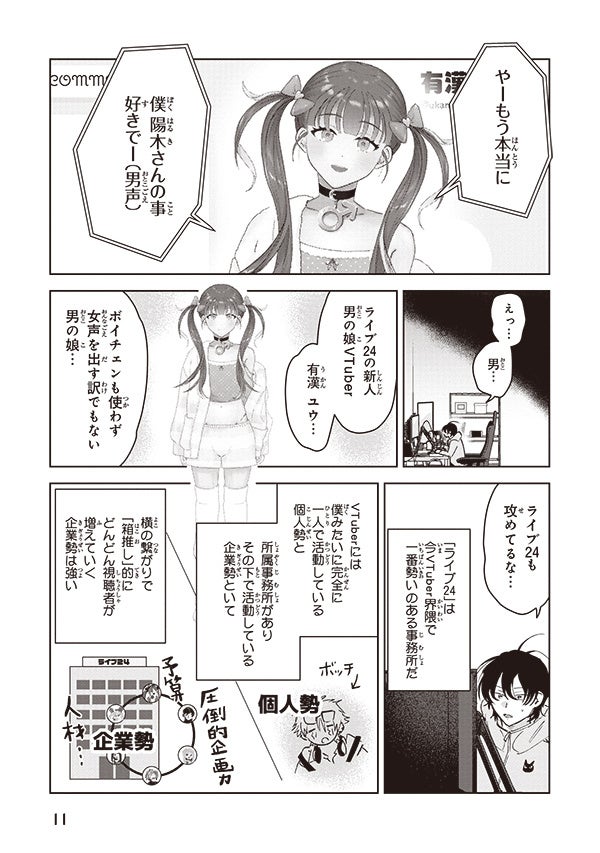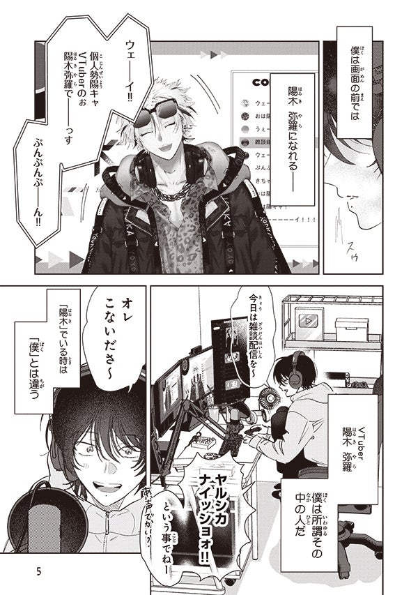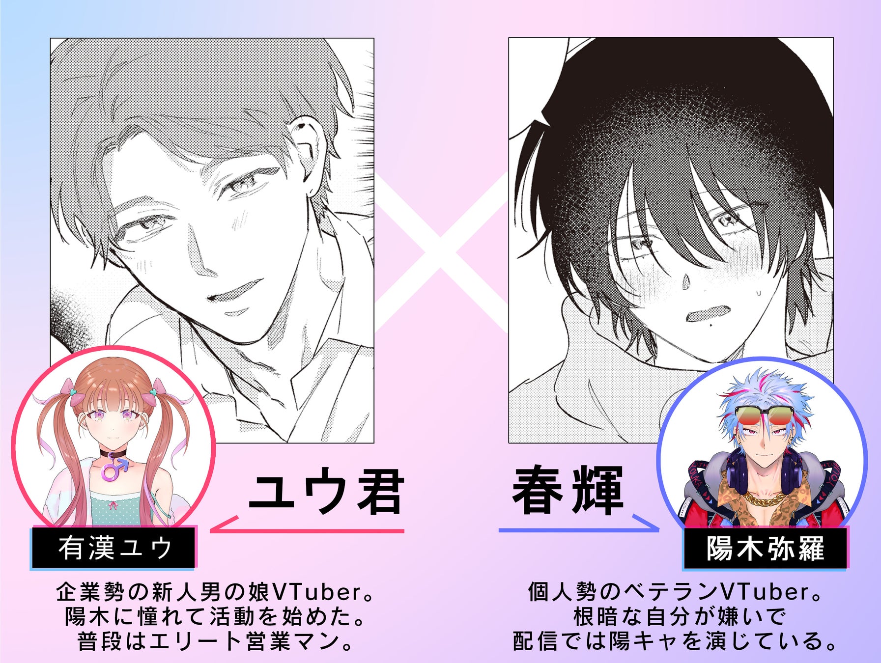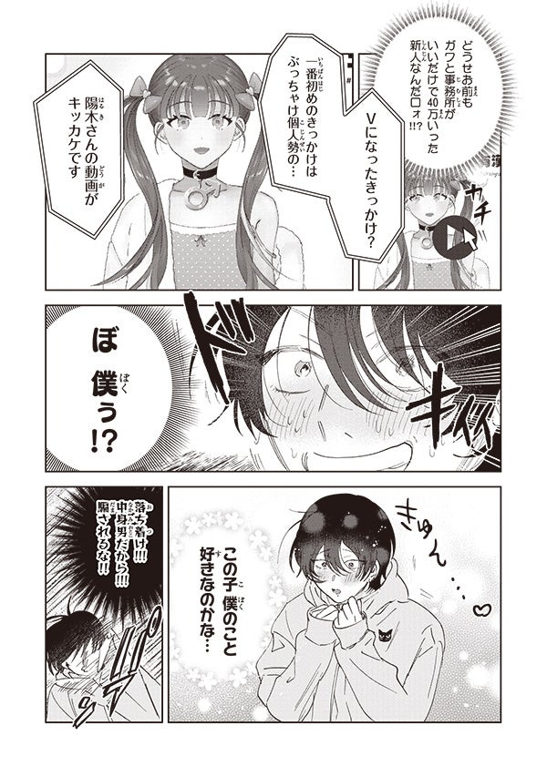 物語は、童貞陰キャの引きこもりVTuber・春輝が、人気の陽キャVTuber・陽木として活動している中、男の娘VTuber・ユウ君と出会い、コラボをすることになる。