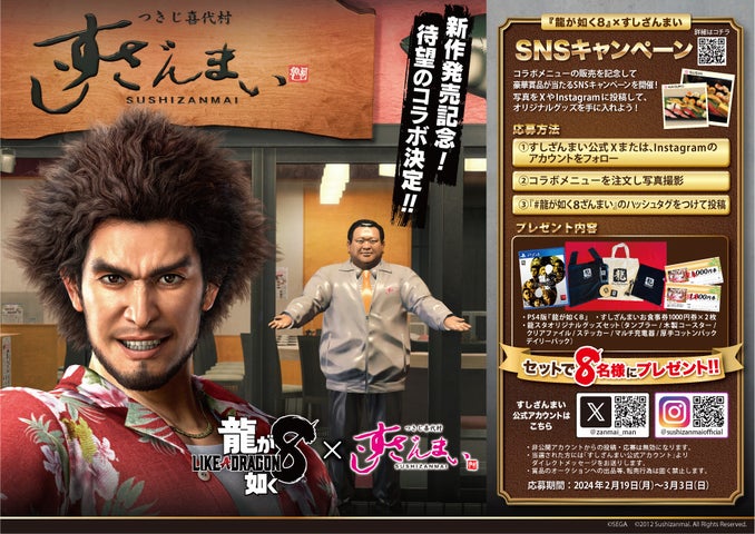- 2024年2月19日から3月3日までの期間、全国41店舗の「すしざんまい」で『龍が如く8』コラボメニューが登場