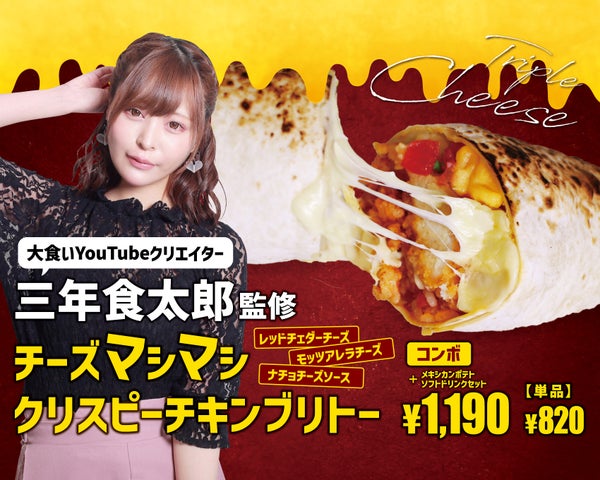 YouTubeクリエイターの「三年食太郎」とTaco Bellがコラボした新メニュー、「チーズマシマシクリスピーチキンブリトー」が2024年2月23日から期間限定で販売されます。