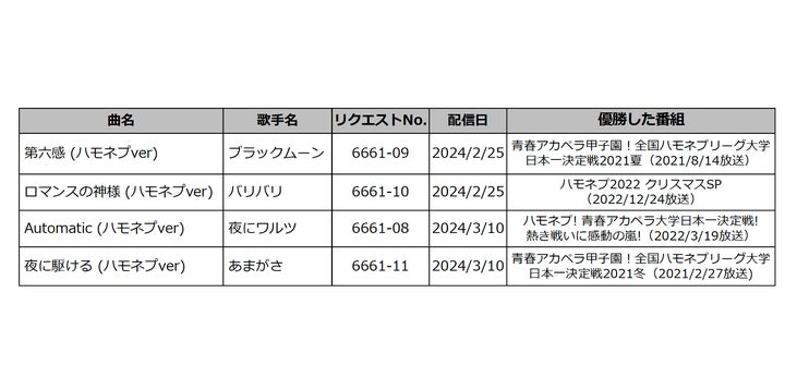 - 2024年2月25日からDAMで『ハモネプリーグ』の歴代人気チームのアカペラパフォーマンス映像を初配信