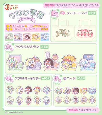 2024年に20周年を迎えるアニメ『ケロロ軍曹』が『まるくじ』に登場!今回は「スイーツパーティー」をテーマにした新イラストグッズが登場中です。