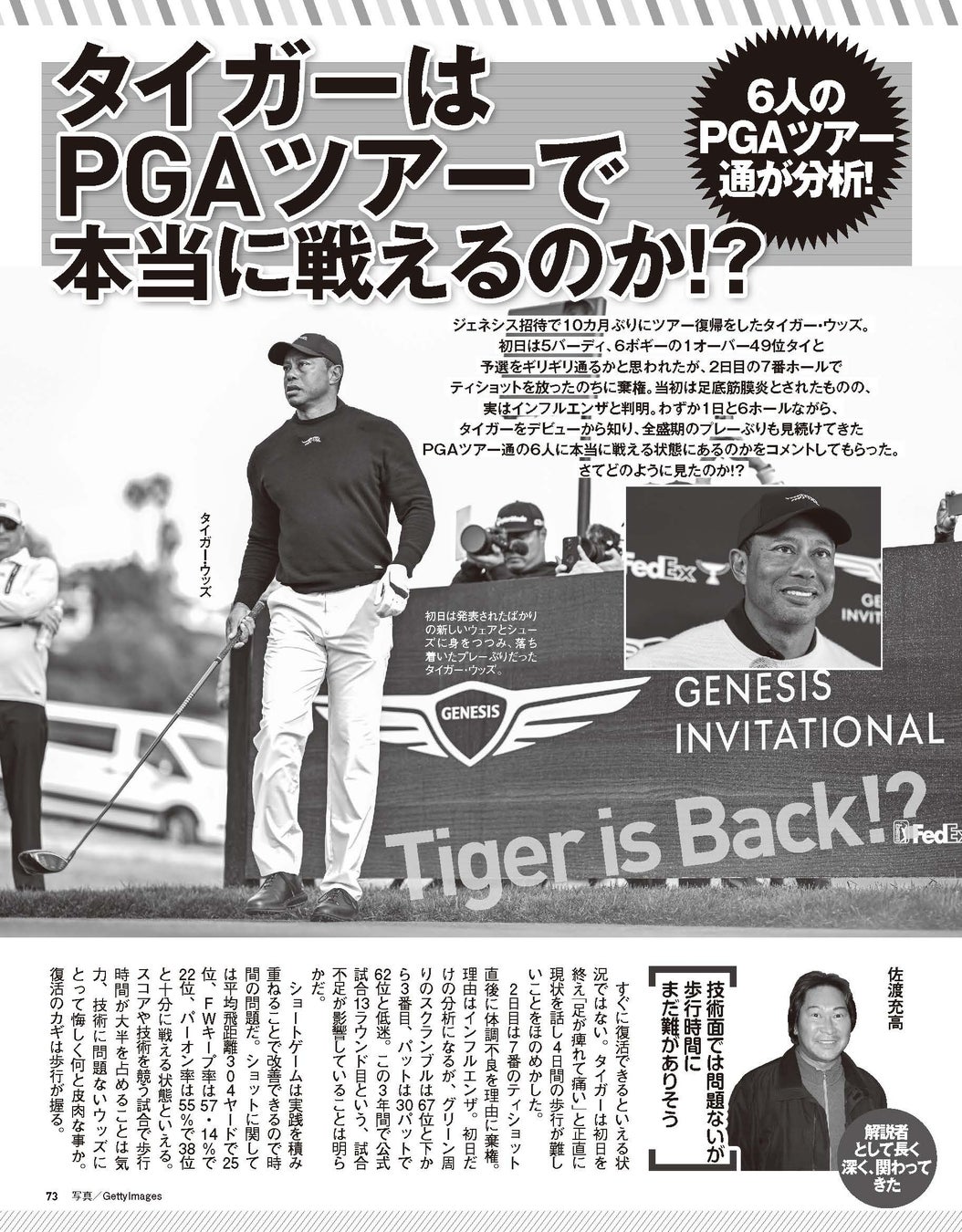 さらに、PGAツアーでのタイガー・ウッズの復活戦や彼の戦いについての特集もあります。