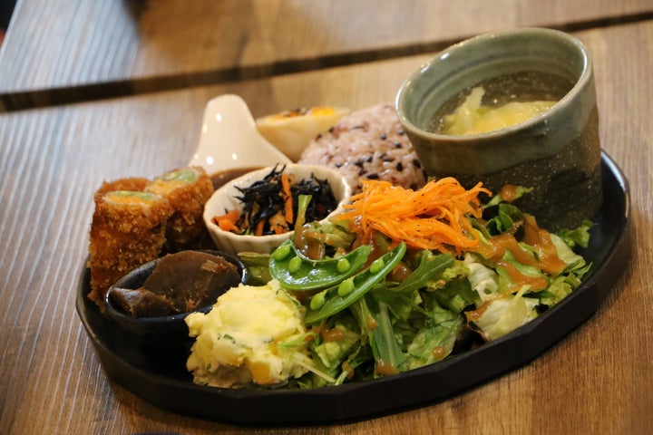 - 近江日野牛のメンチカツ、モロコの佃煮、うすき鍋