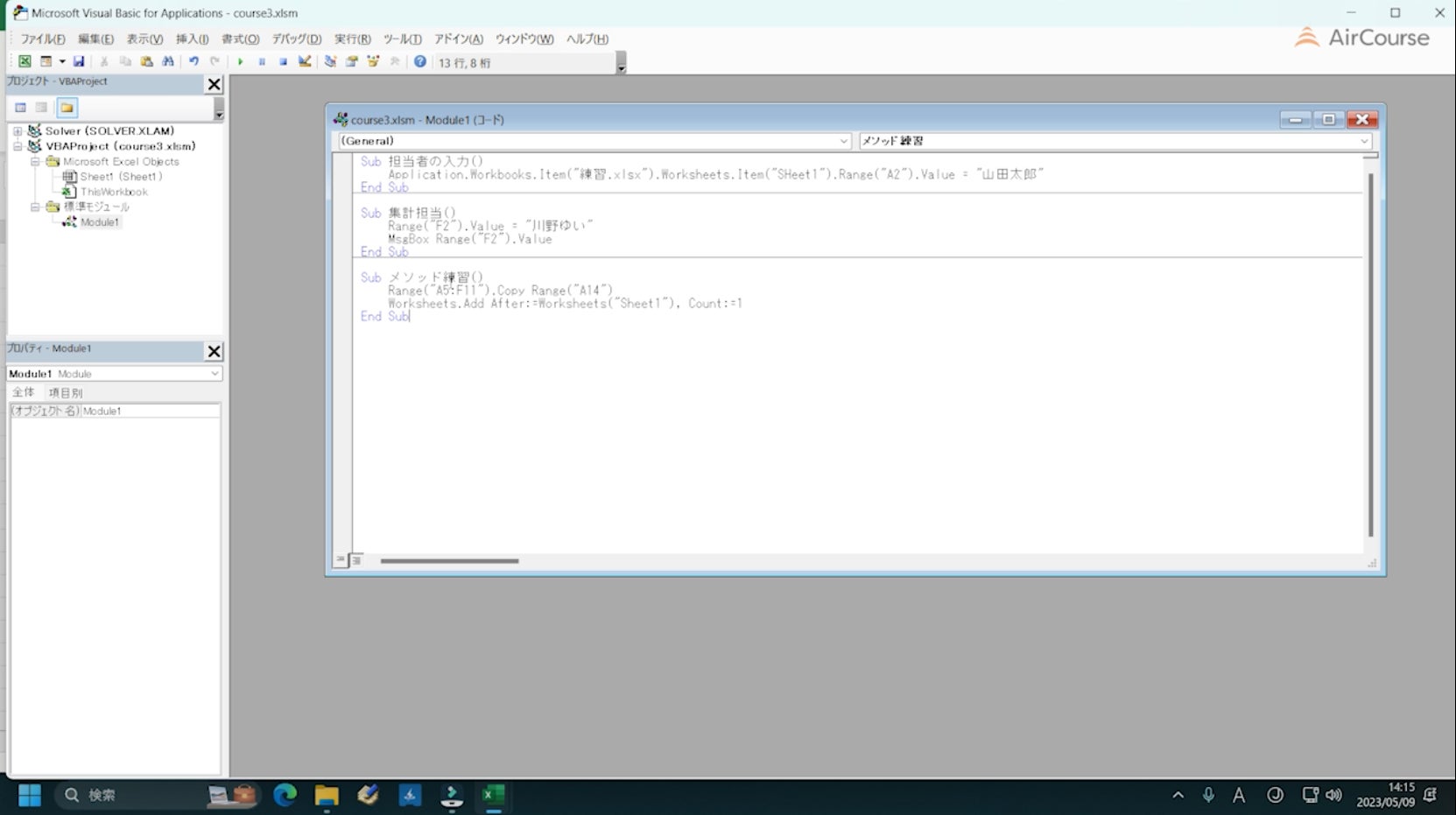 Excelマクロ&VBA基礎コース、AirCourseのExcelシリーズ