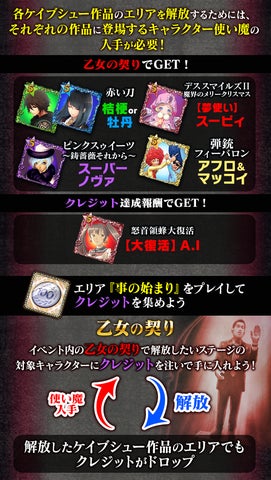 イベントではケイブ作品のキャラクターが使い魔として登場し、コラボステージや限定ストーリーを楽しむことができます。