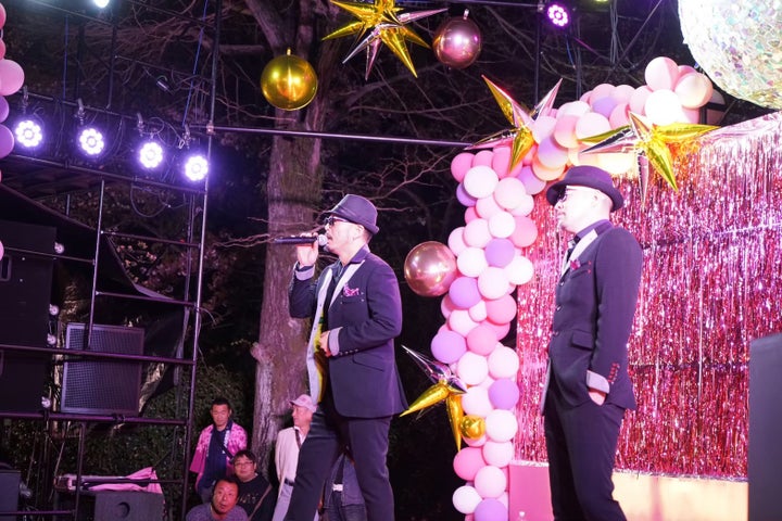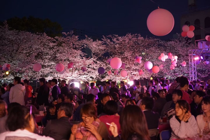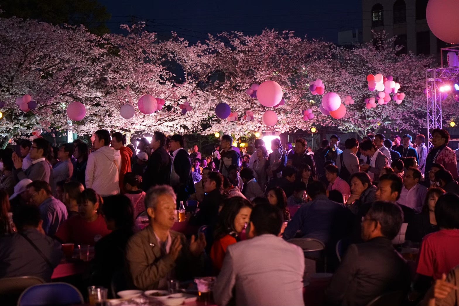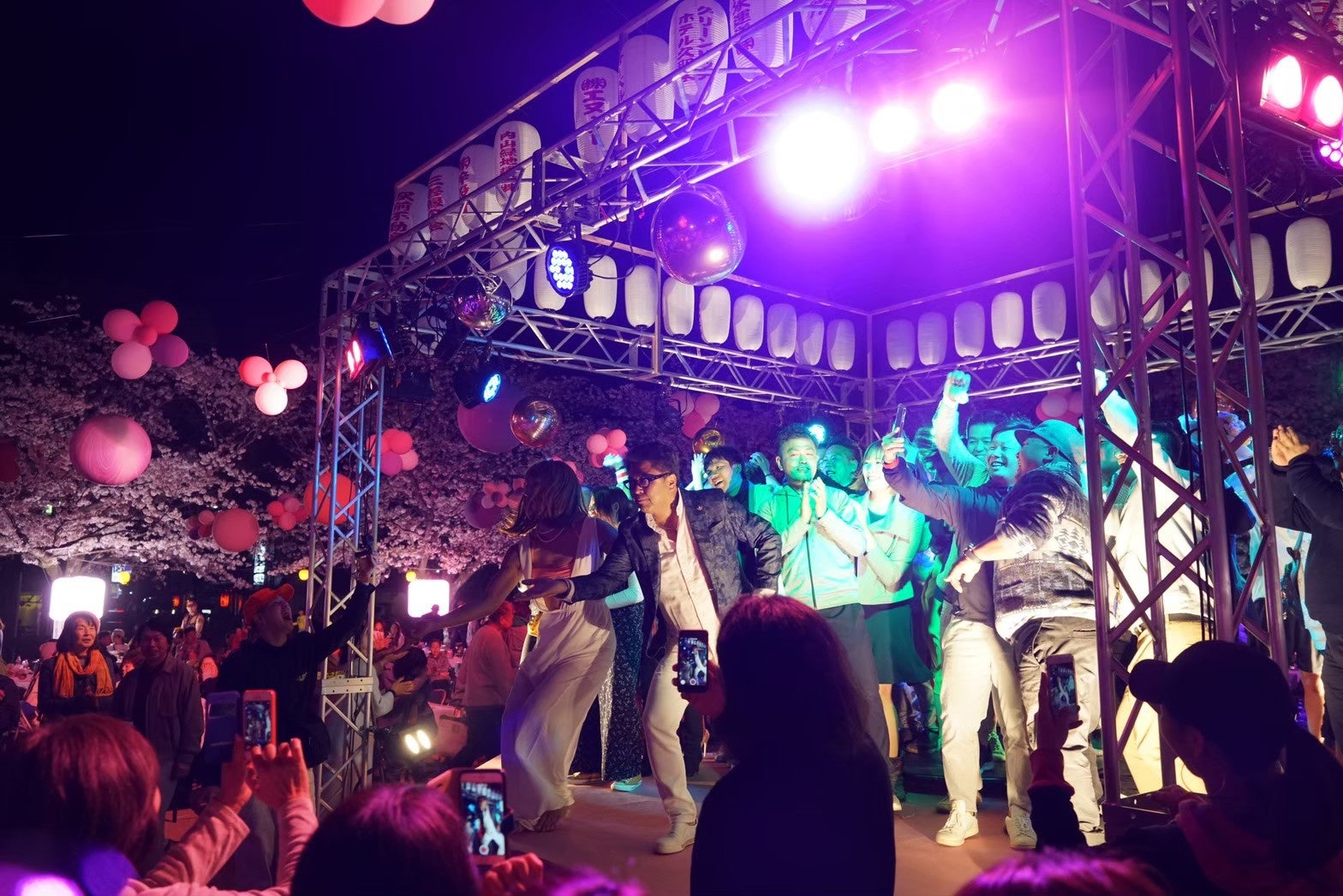 桜とピンクのバルーンで飾られ、昭和と令和のヒットソングで野外ディスコを楽しむことができます。