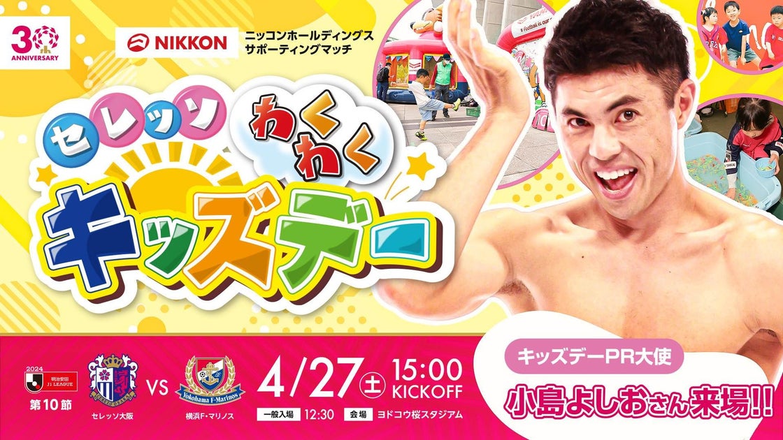 4月27日にセレッソ大阪と横浜F・マリノスが対戦し、小島よしおさんがPR大使に就任します。