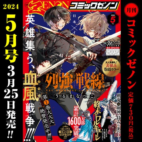 株式会社コアミックスから発売された『列強戦線』第1巻が3月19日に発売され、3月25日に発売された「月刊コミックゼノン5月号」で表紙&巻頭カラーを飾っています。