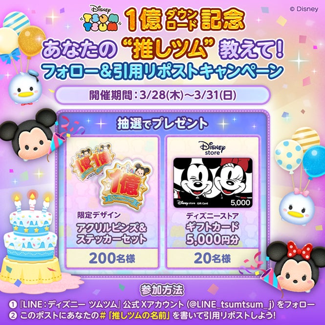 ディズニーのカジュアルパズルゲーム『LINE:ディズニー ツムツム』が世界累計1億ダウンロードを突破しました。