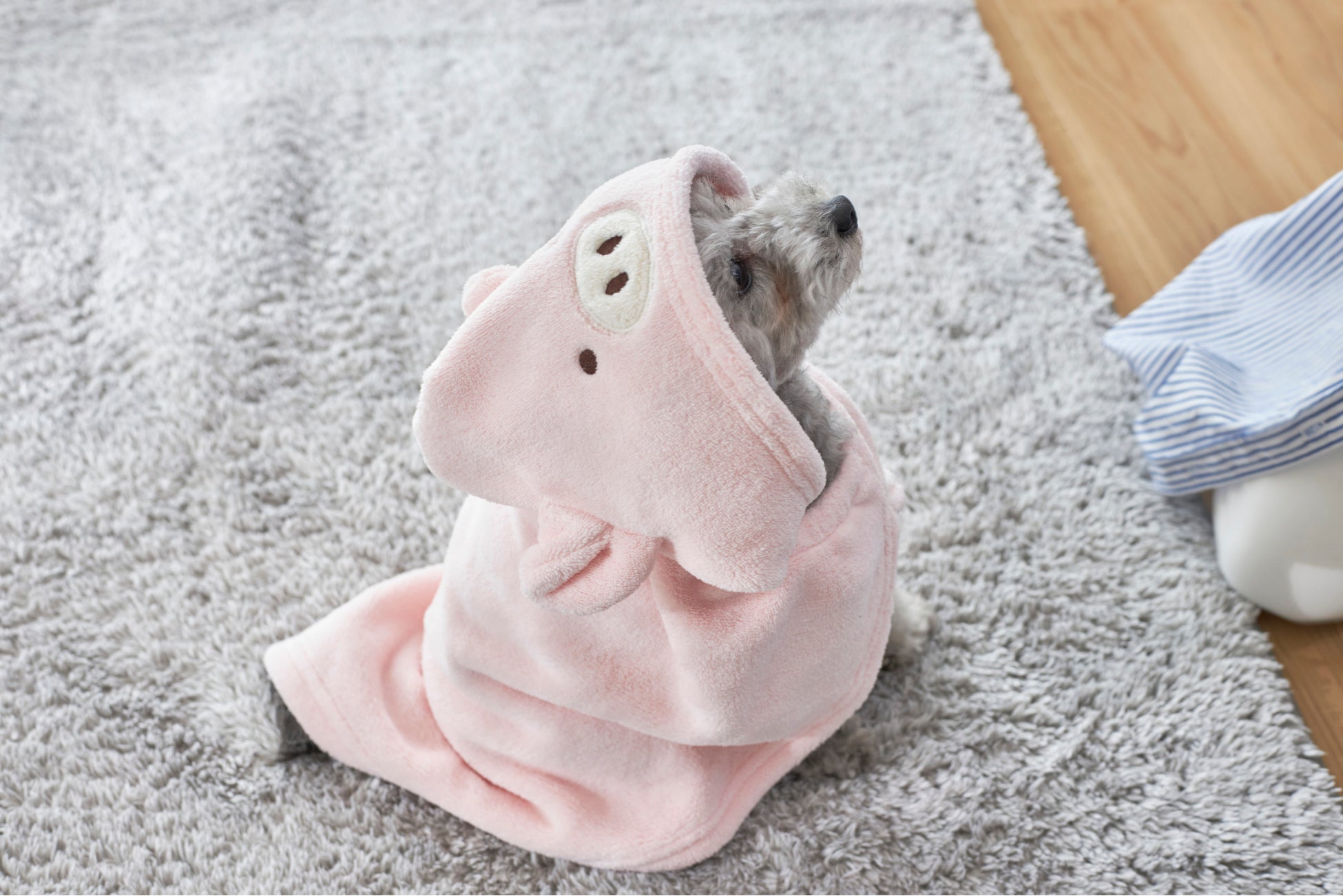 被せるだけで素早く吸水する速乾性に優れたマイクロファイバーを使用したペット用ローブです。超小型犬~小型犬・猫に対応したサイズで、シャンプー後や雨の日のお散歩後に被せるだけでご利用できます。イヌ、ネコ、パンダ、クマ、カエル、ブタの5種類・5カラーは今回オリジナルラインナップです。