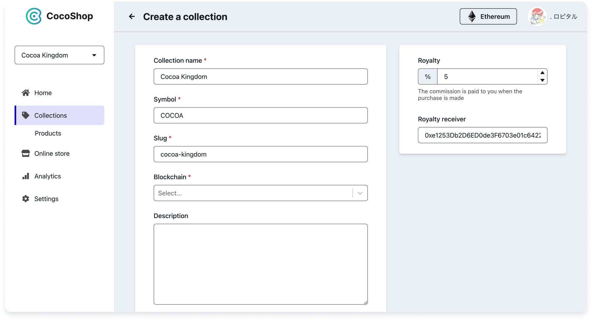 CocoShopはNFTの作成、NFTストアの開設、売上分析などを簡単に行うことができるNFTストア構築プラットフォームです。