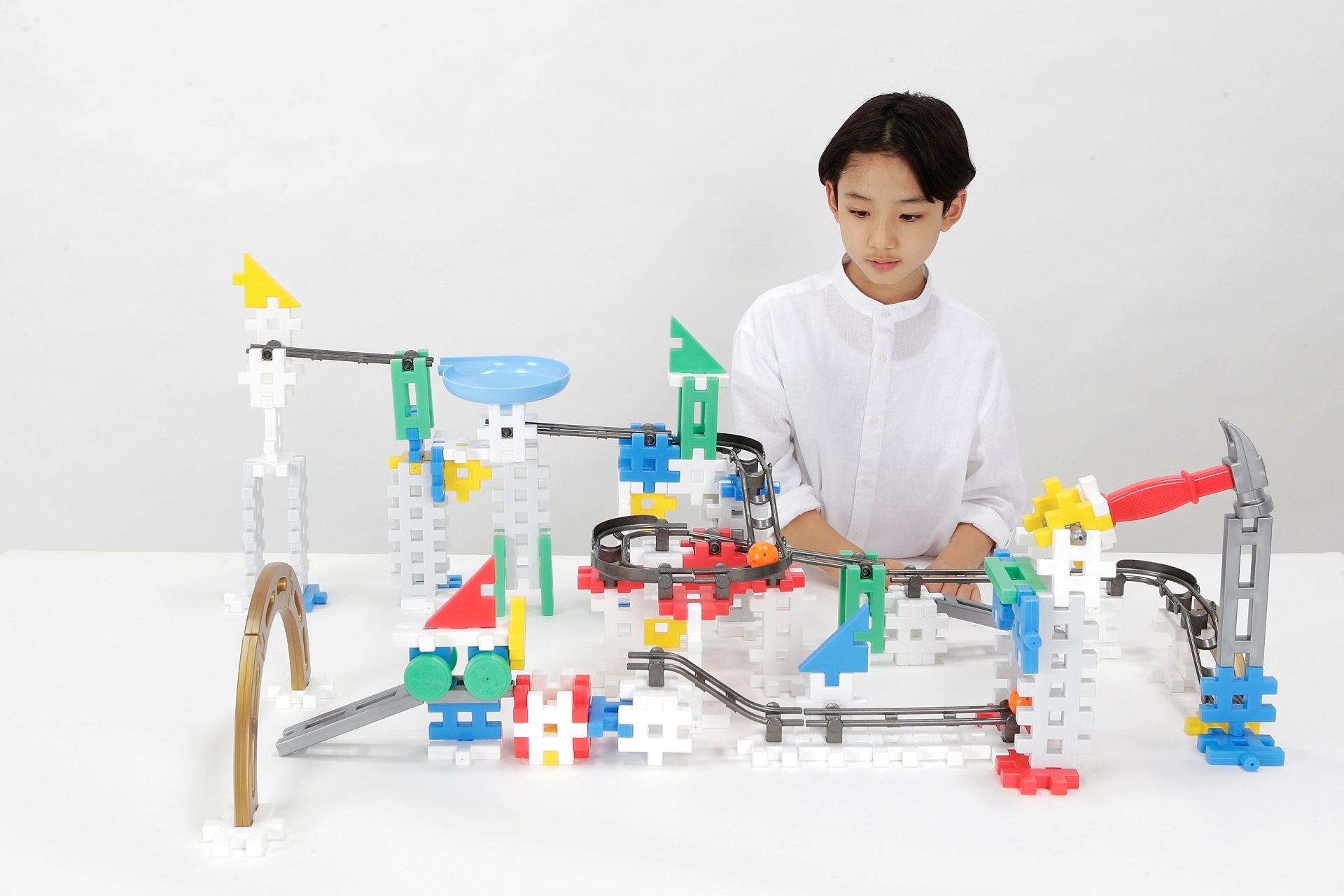 - 3. ブロックに専用レールを取り付け、150個のパーツで全長2mを超える巨大コースを作成可能。価格は11,000円(税込)。