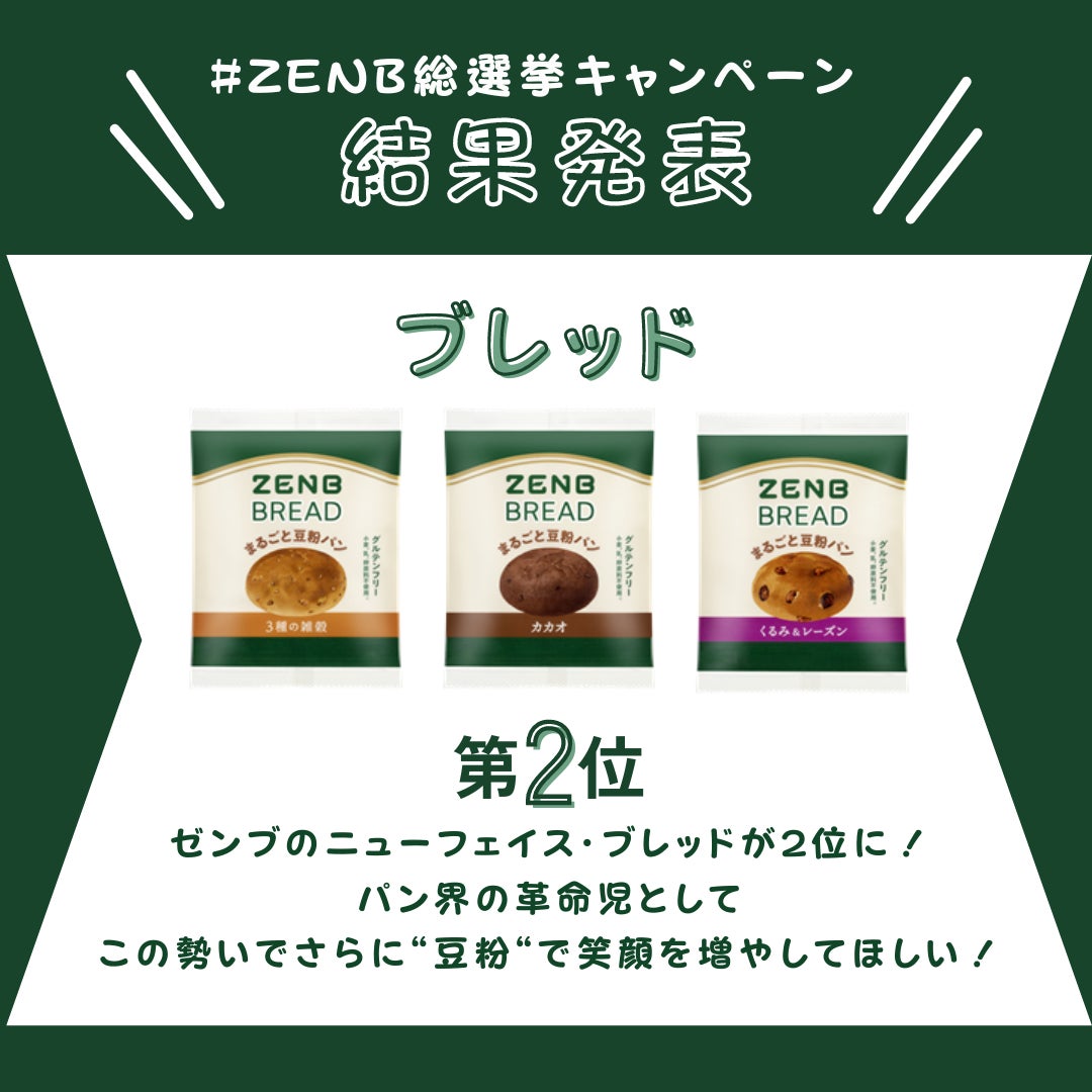 第2位は「ZENBブレッド」で、まるごと豆粉パンのふんわりとした食感が好評です。
