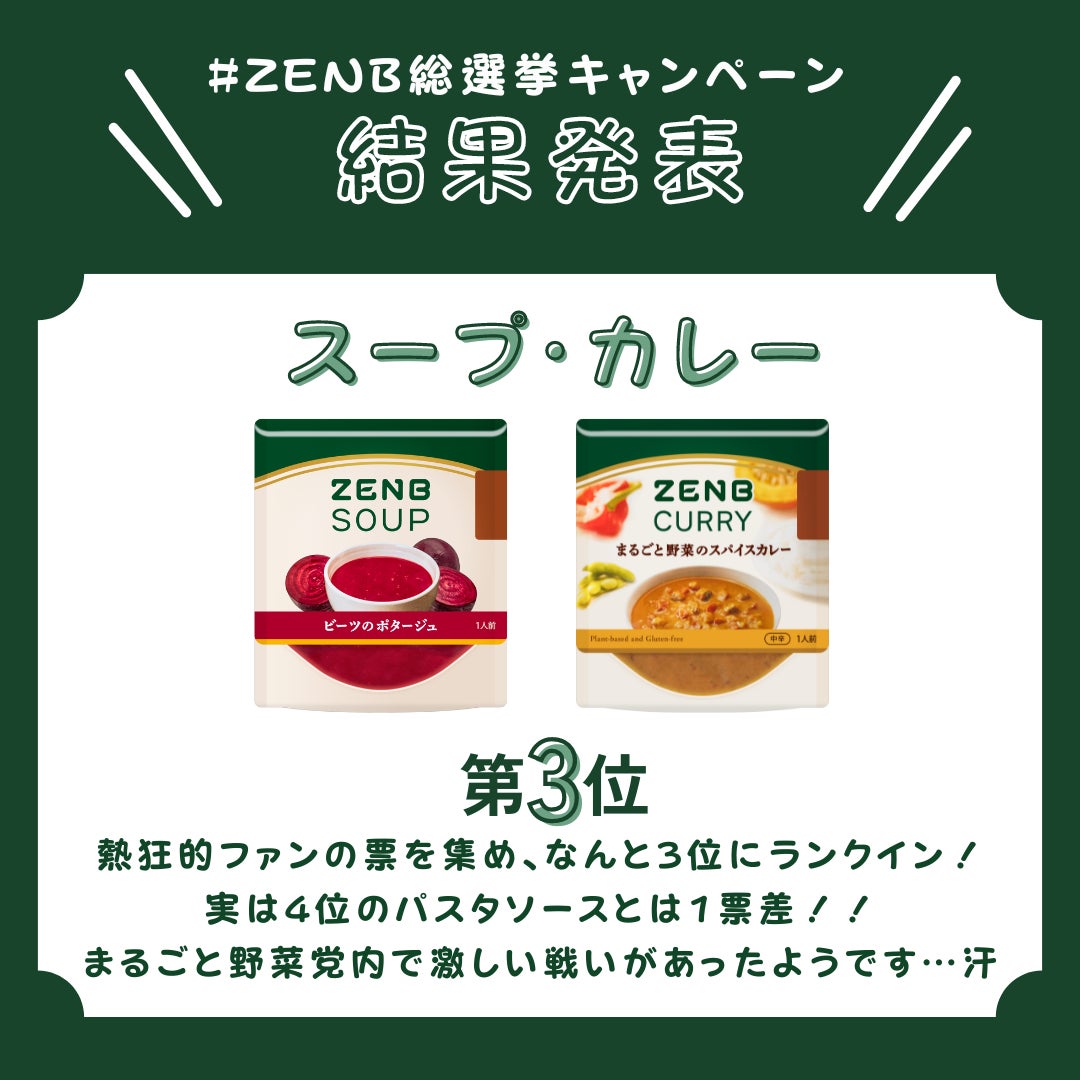 第3位は「ZENBスープ・カレー」で、まるごと野菜を凝縮したスープ・カレーが手軽さとおいしさで人気です。