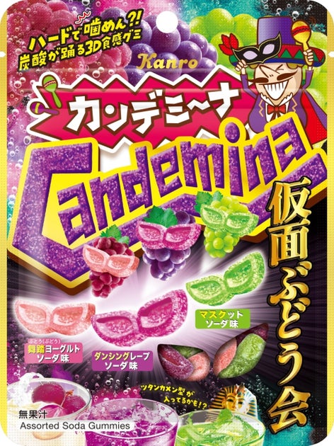 新商品「カンデミーナグミ仮面ぶどう会」は、仮面型のグミで、3種のぶどうソーダ味を楽しめます。