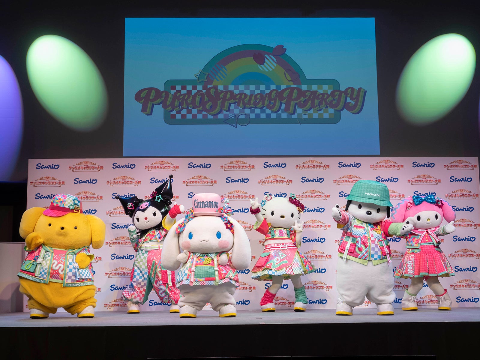 サンリオの新作参加型ショー「超FRESH SAKURA PARTY!」が100名のゲストに披露され、シナモロールやハローキティなどがピンク&グリーンのコスチュームで登場し、会場は大いに盛り上がりました。