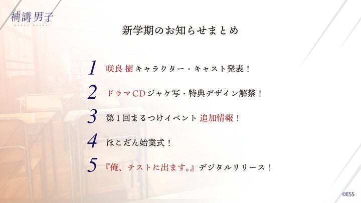株式会社アース・スター エンターテイメントがリリースした”着席”プロジェクト「補講男子」は、4月11日に始業式を生配信し、テーマソングや新情報を公開しました。