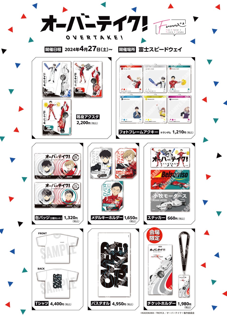TVアニメ『オーバーテイク!』のグッズが登場!等身アクスタや缶バッジ、フォトフレームアクリルキーホルダー、メタルキーホルダー、ステッカー、Tシャツ、バスタオル、チケットホルダーなどが揃います。