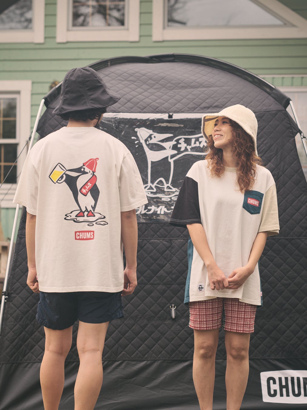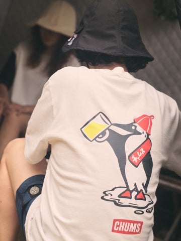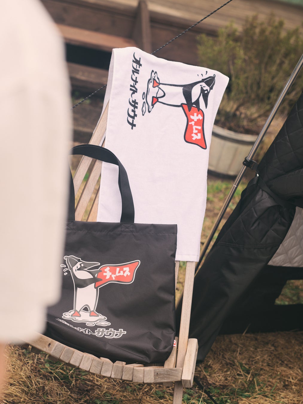 チャムスとサウナブランド「サウベニア」のコラボレーションアイテムには、愛らしいブービーバードが描かれたTシャツやサウナタオル、メッシュトートなどがラインナップされています。