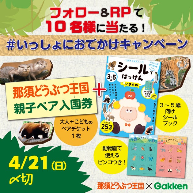 - 那須どうぶつ王国とのコラボで、シールブック『シールではっけん いきもの』と親子ペア入国券が当たる