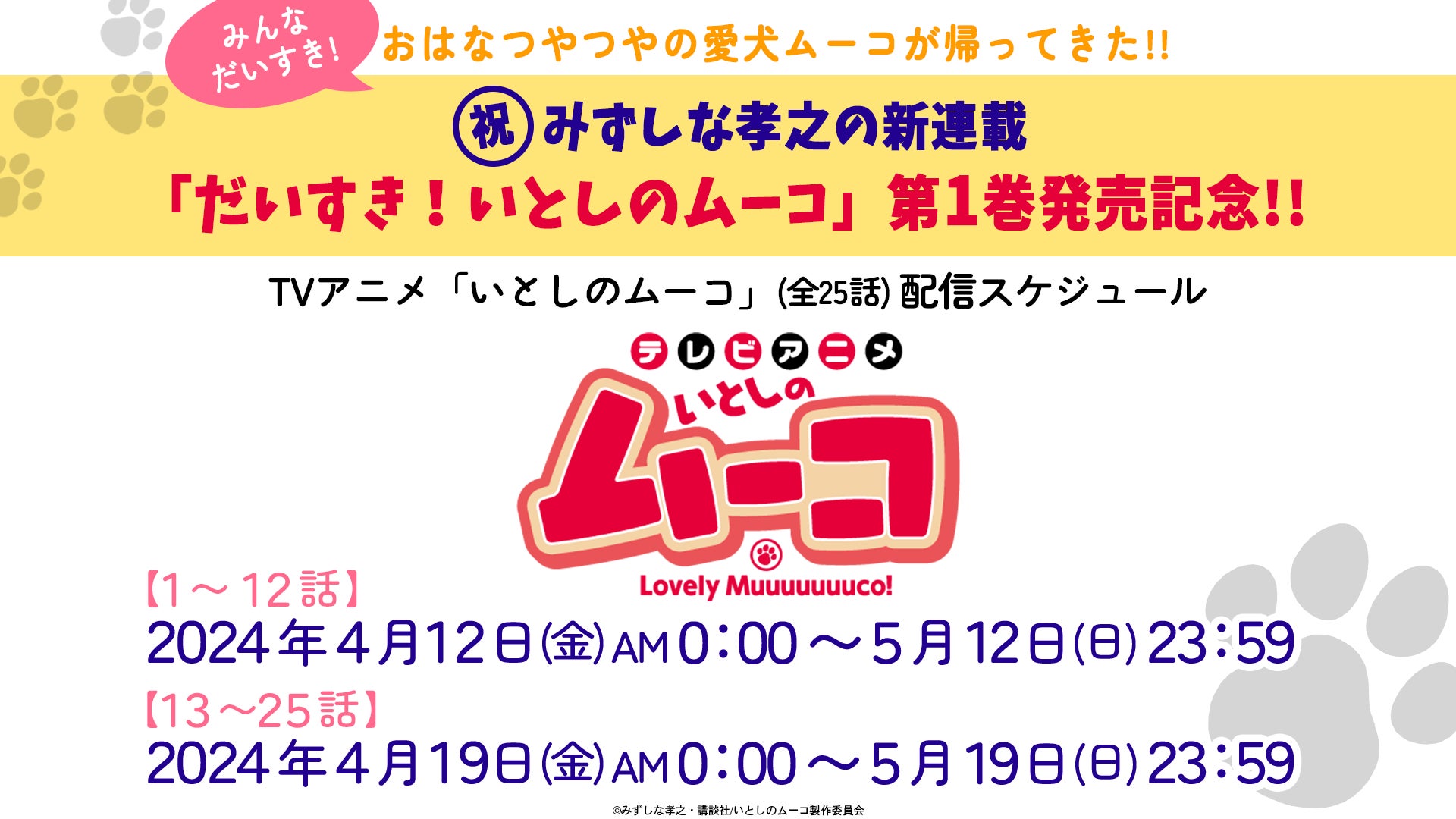 6月12日に発売予定の「だいすき!いとしのムーコ」第1巻に合わせ、YouTubeチャンネル「フル☆アニメTV」でTVアニメ「いとしのムーコ」全25話を無料配信します。