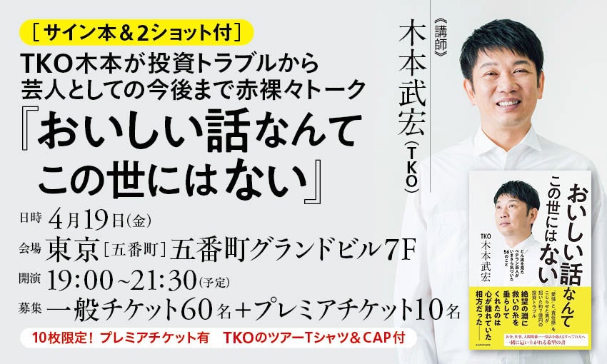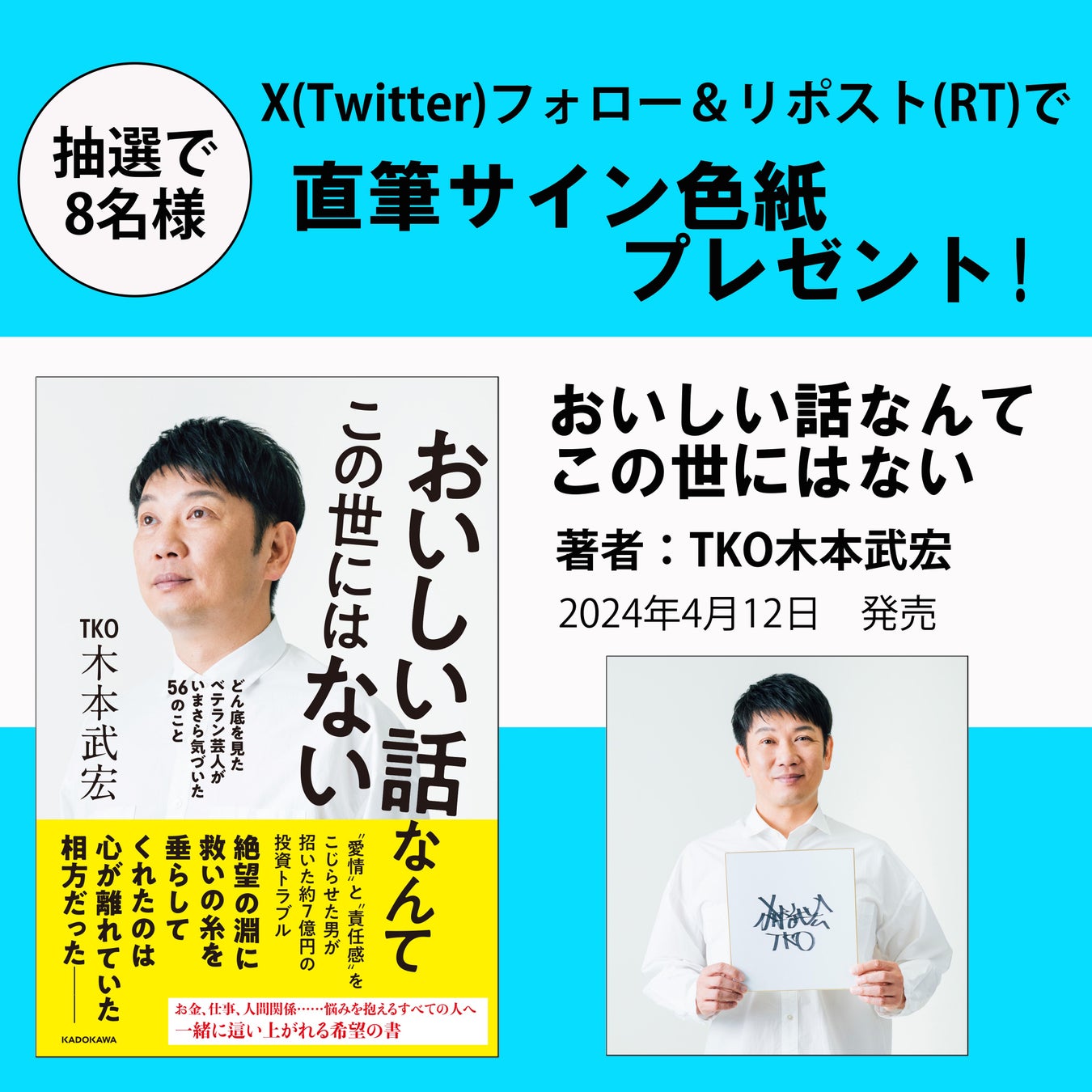 KADOKAWAノンフィクション公式アカウントのTwitterキャンペーン「おいしい話なんてこの世にはない」著者TKO木本武宏氏サイン色紙プレゼントキャンペーンが開催中です。