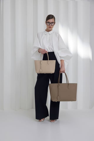 エマバッグや新サイズのミアトートバッグなど幅広いアイテムが展示され、ユニセックス向けのパオロクロスボディバッグやリアバッグも充実しています。