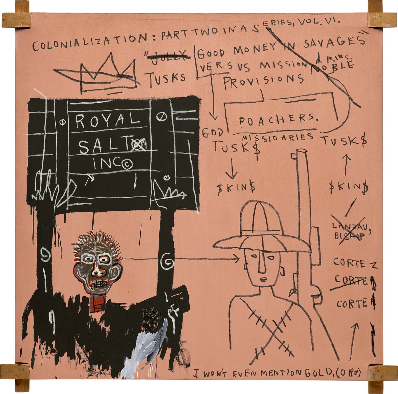 さらに、≪Native Carrying Some Guns, Bibles, Amorites on Safari≫は、植民地時代や人種問題に対するバスキアの鋭い問題意識を表現しています。