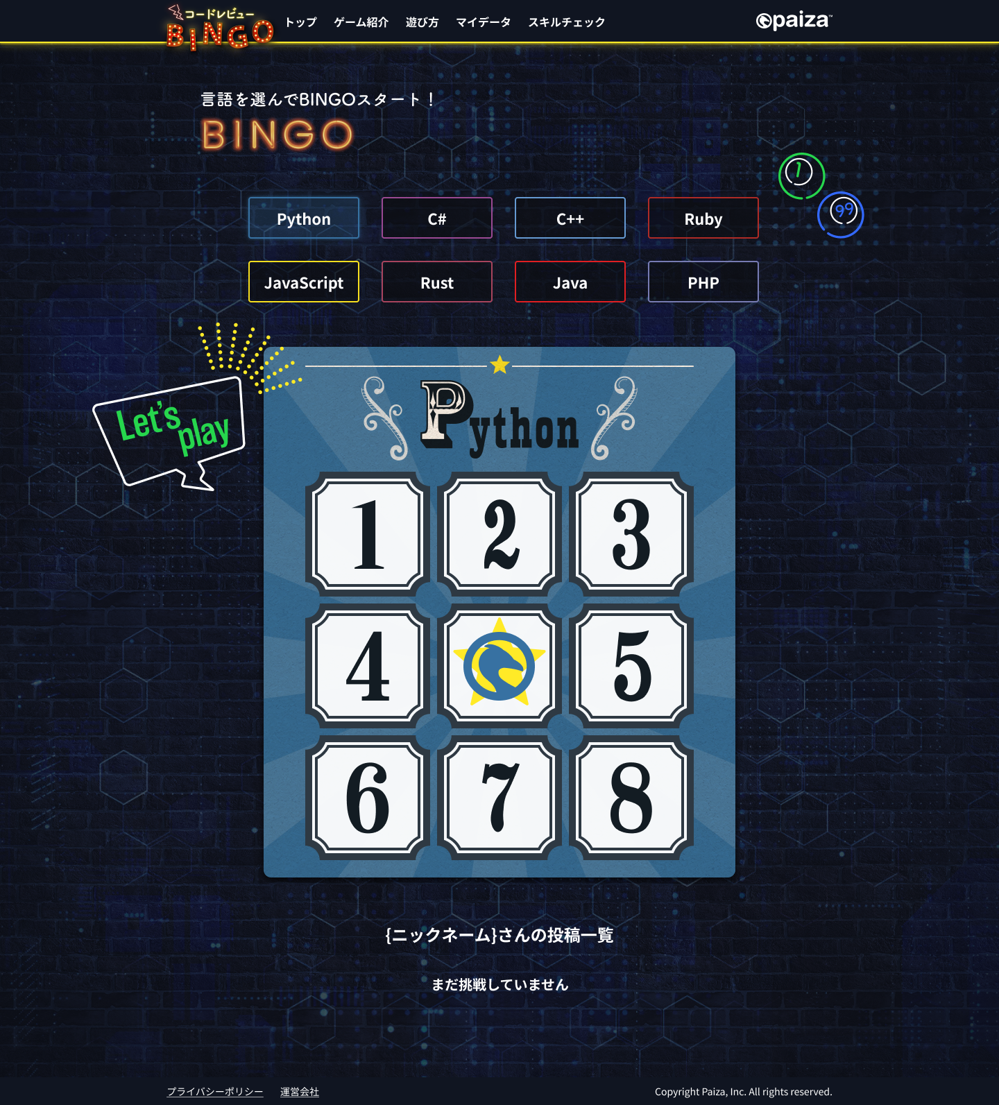 プログラミング初級者から中・上級者まで楽しめるビンゴ形式のゲームで、Python、C#、C++、Ruby、Java、JavaScript、PHP、Rustの8言語から選べる。