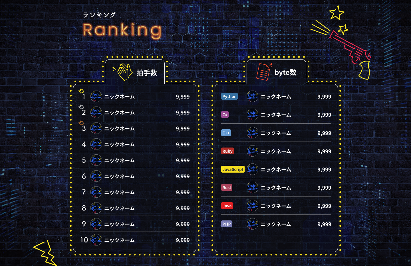このほか参加者同士で“イケてる”コードに拍手を送り合ったり、送られた拍手数、各言語別のbyte数ランキングを見て楽しむことも可能です。
