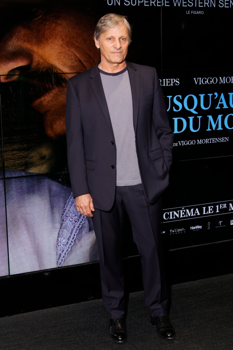ヴィゴ・モーテンセンはキム・ジョーンズのデザインを身に着け、ミッドナイトブルーのウール素材のスーツとブラックレザーのシューズで登場しました。