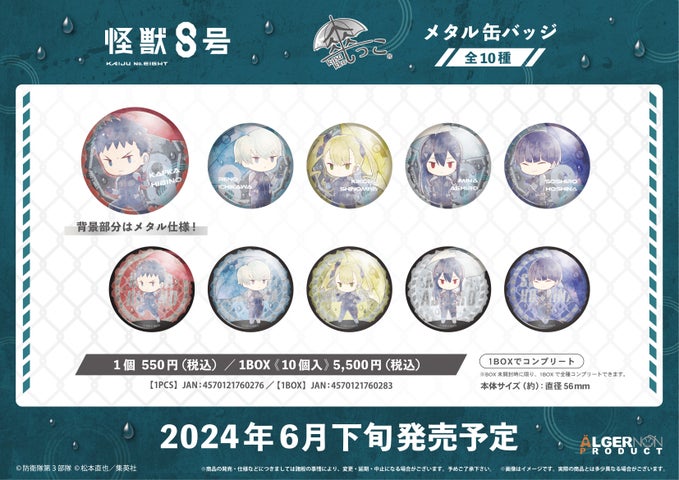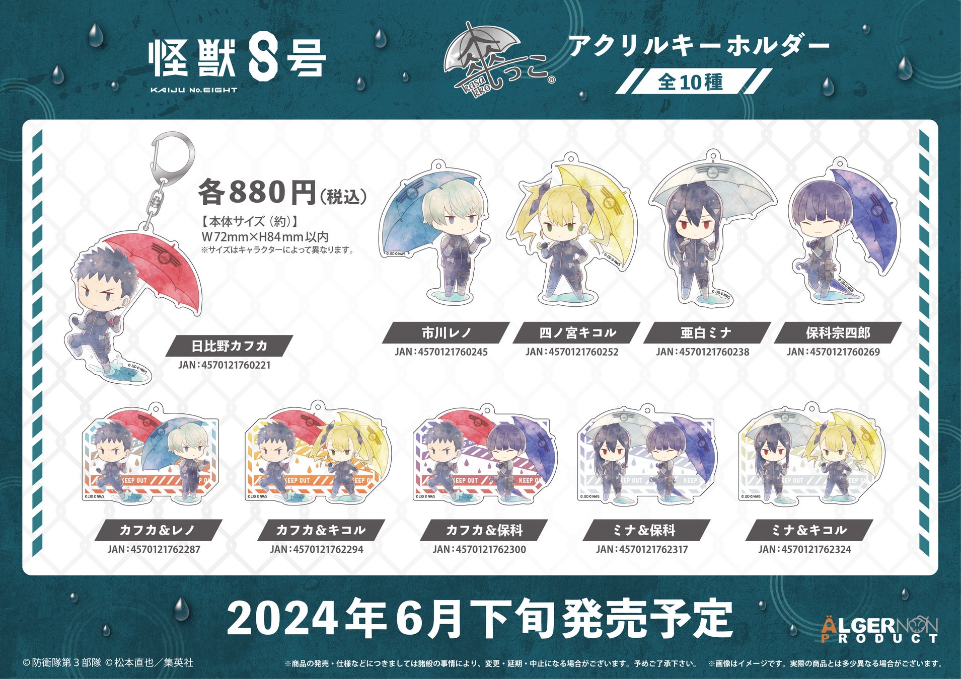 「怪獣8号」と「傘っこ」の世界観を融合したアクリルスタンド、アクリルキーホルダー、メタル缶バッジが登場!各アイテムの価格、種類、予約受付、発売日、販売店情報が公開されました。