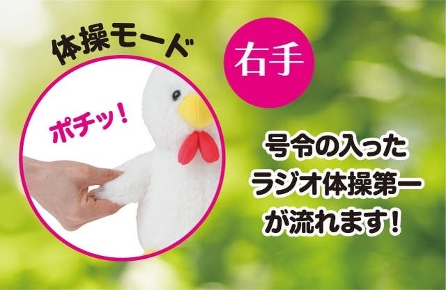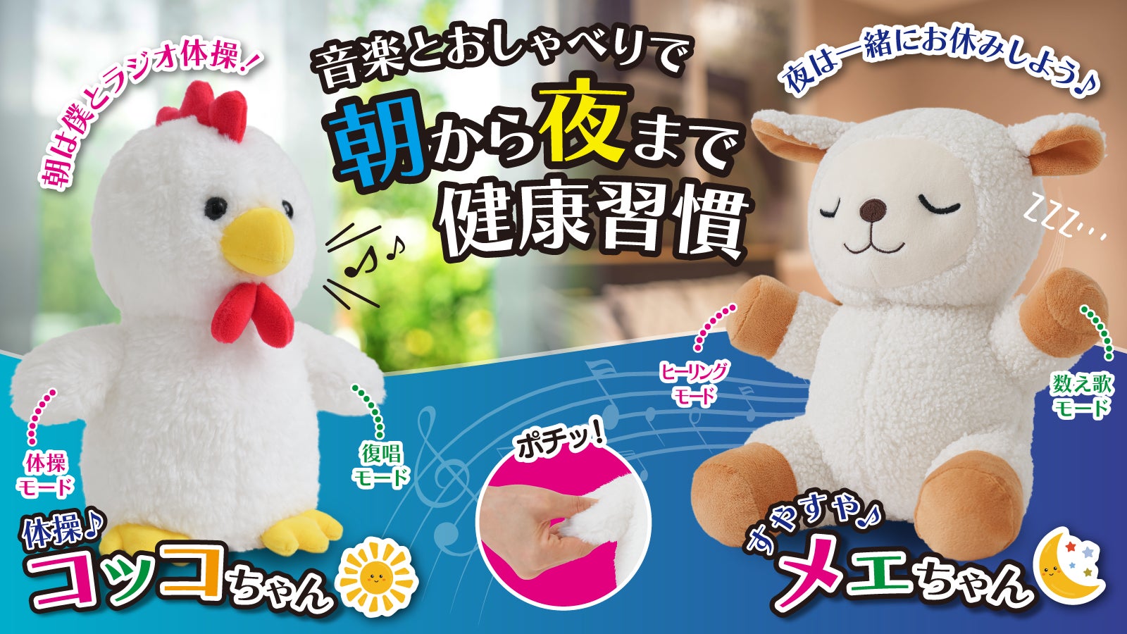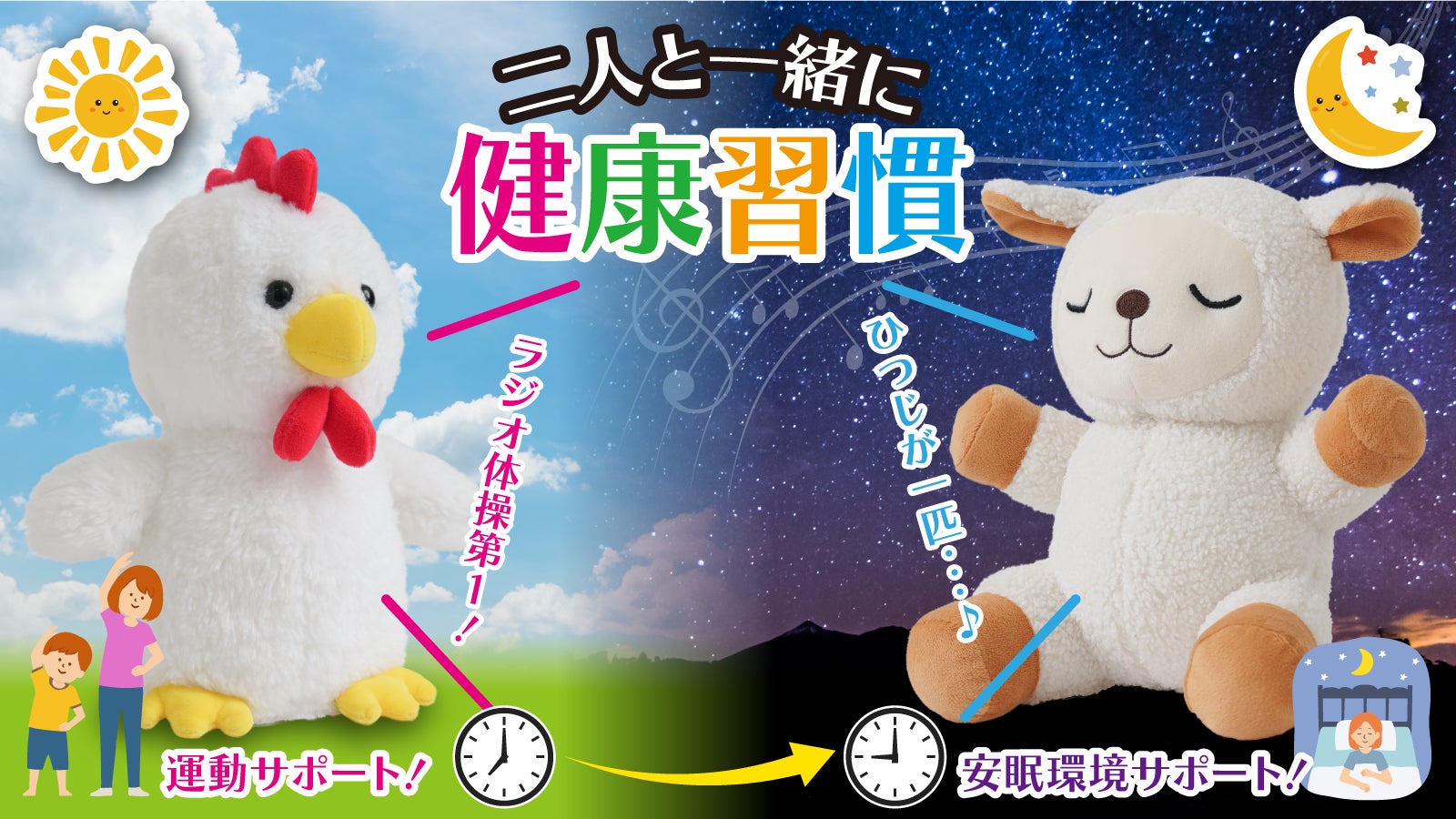 健康と癒しをテーマにした新しいぬいぐるみで、体を動かすことと睡眠の重要性を強調し、コッコちゃんとメェちゃんが健康生活をサポートします。