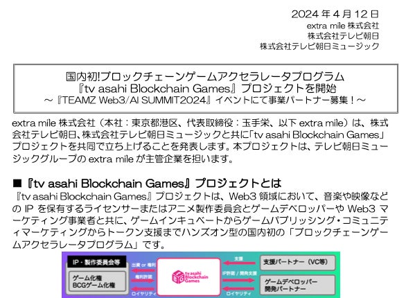 extra mile株式会社は、株式会社テレビ朝日と株式会社テレビ朝日ミュージックと共同で「tv asahi Blockchain Games」プロジェクトを始動します。