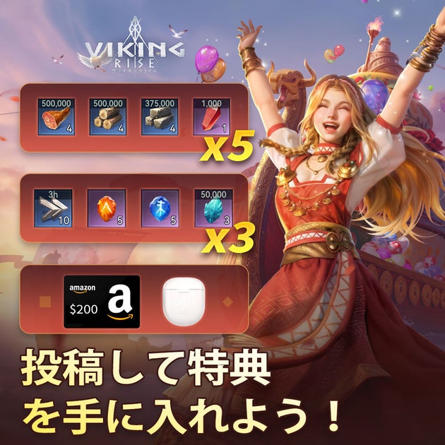 ヴァイキングライズが1周年を迎え、SNSで関連画像や動画を投稿すると豪華賞品がもらえるアニバーサリーシェアイベントが開催中です。