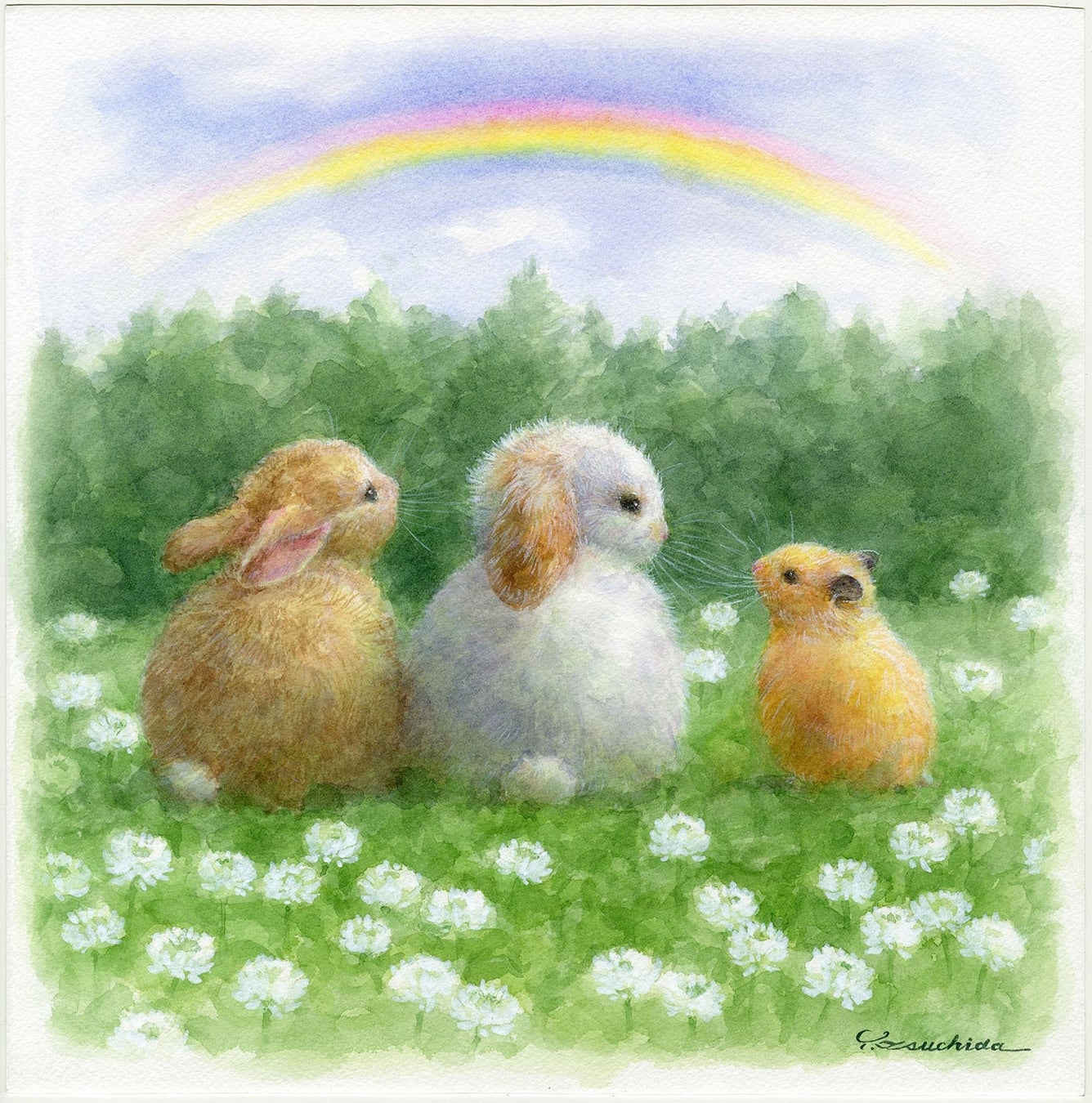 長野県在住で、柔らかな自然からインスピレーションを受け、愛らしいうさぎや鳥を描いています。